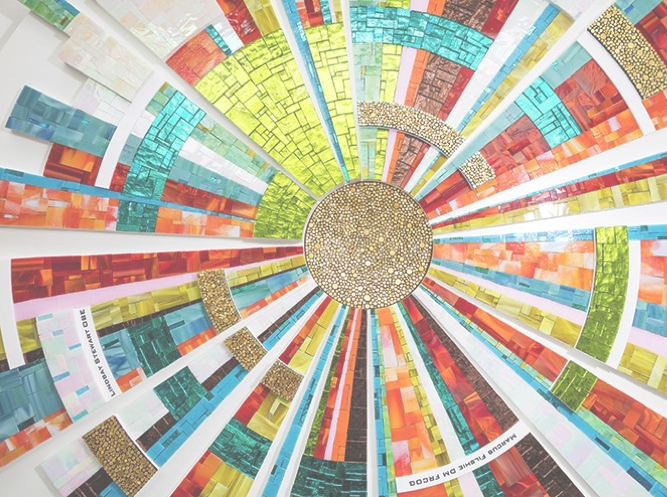 - What topics are represented in each of the mosaic art pieces?
