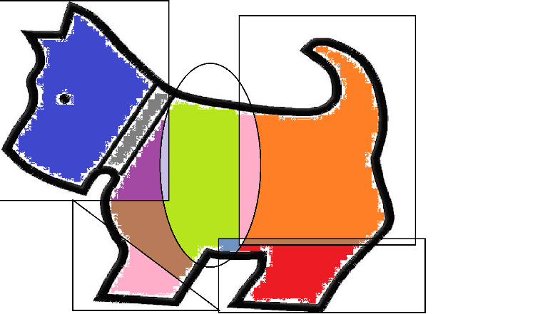 2. Explain basic geometric shapes (15 mins) Ask students to put their drawings to one side. On the board, show basic geometric shapes, and ask students what they may have in common, and how they differ from each other. Solicit answers so as to lead them to understand the concept of corners, angles and sides. 3. Creating and using stencils for each shape (20 mins) Once students have created their stencils, they use it to outline them over the original drawing using a black pen, thus segmenting the drawn animal in various geometrical shapes. The students will then colour in the various segments, using different colours. Example: