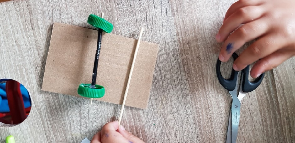 Stick the wooden sticks to the down part of chassis ensuring that the sticking-out-part has the same length from each side (if the sticks are too long cut off some part of it)