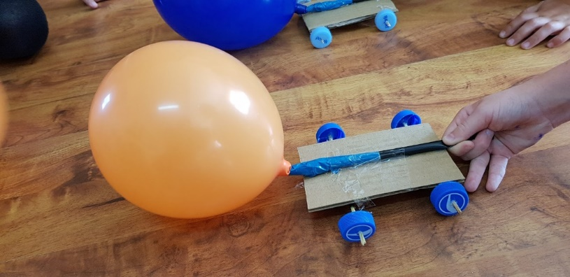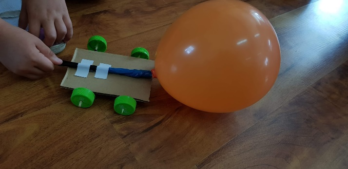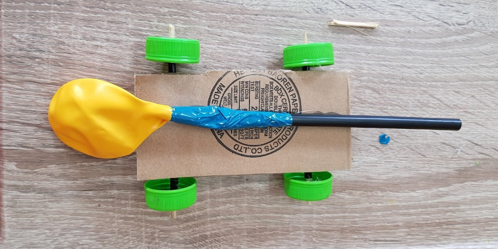When all of the elements are ready you can place the vehicle on the empty area and open the other ending of the straw to start the air flow. Because of the strong air flow your vehicle should move.